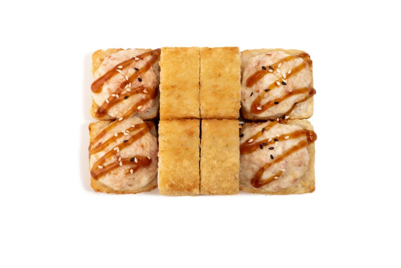 НЬЮ-ЙОРК ЗАПЕЧЕНЫЙ350 гЗапечённый темпура ролл со сливочным сыром и креветкой темпура под сырной шапочкой с беконом, с соусом терияки и кунжутом.