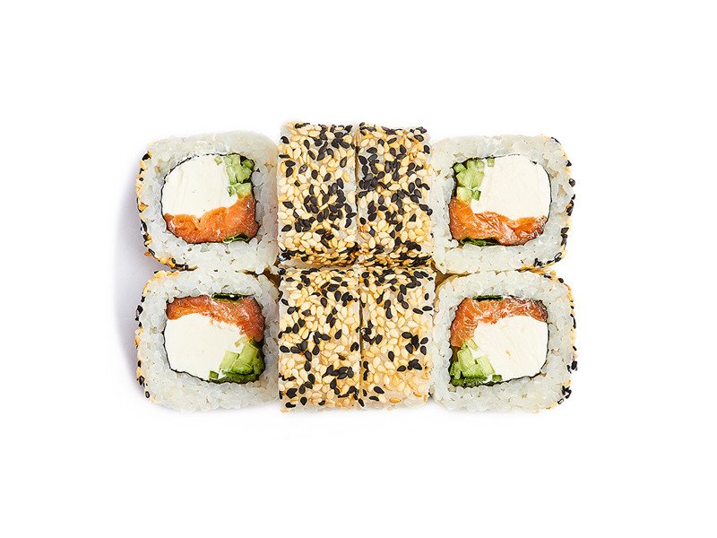Ролл со сливочным сыром, копчёной кетой, огурцом, зелёным луком и кунжутом.