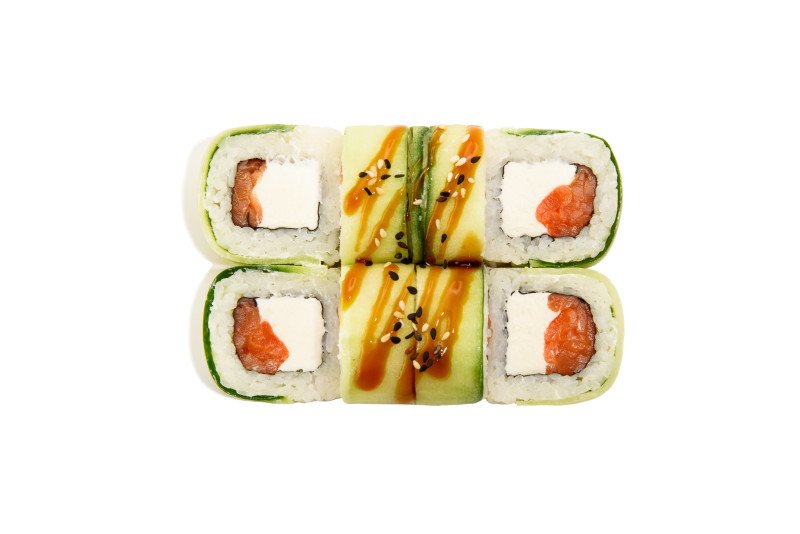 Ролл со сливочным сыром, лососем и огурцом, полит соусом терияки и украшен кунжутом.