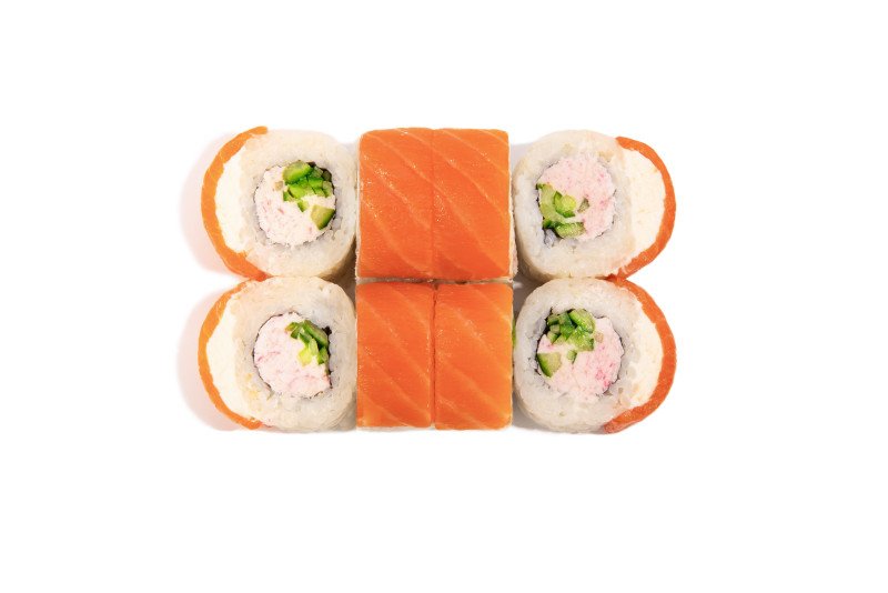 Ролл с лососем, сливочным сыром, огурцом и начинкой на выбор..