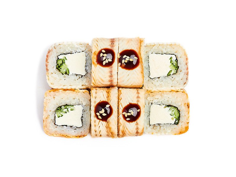 Ролл с угрём, сливочным сыром и огурцом, украшен соусом унаги и кунжтом.