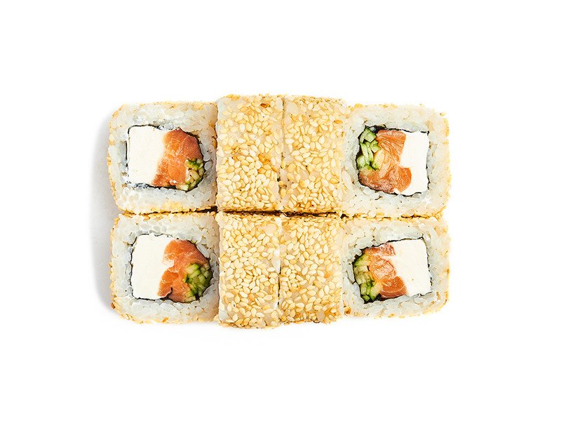 Ролл в обжаренном кунжуте со сливочным сыром, огурцом и лососем.