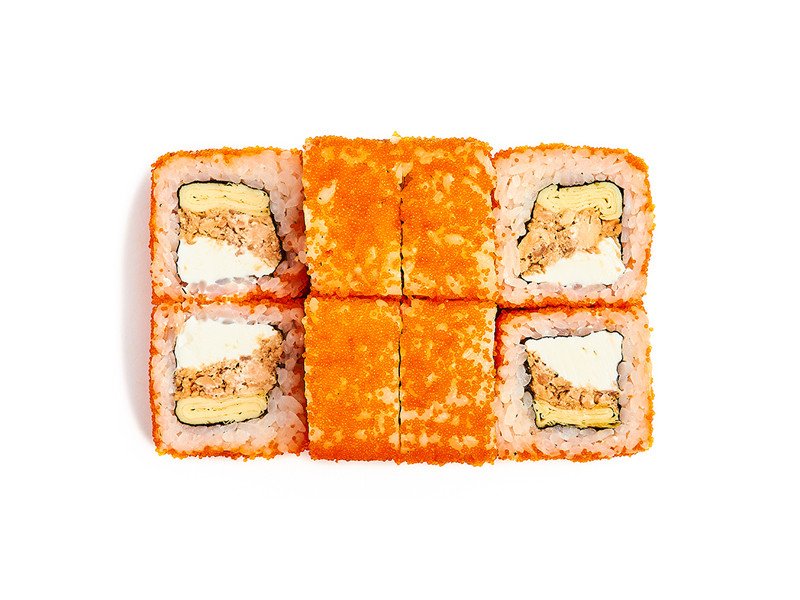 Ролл со сливочным сыром, омлетом томаго, жареным лососем терияки и икрой массаго.