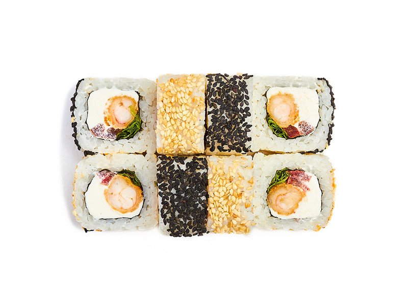Ролл с креветкой темпура, салатом, сливочным сыром, томатом и кунжутом.