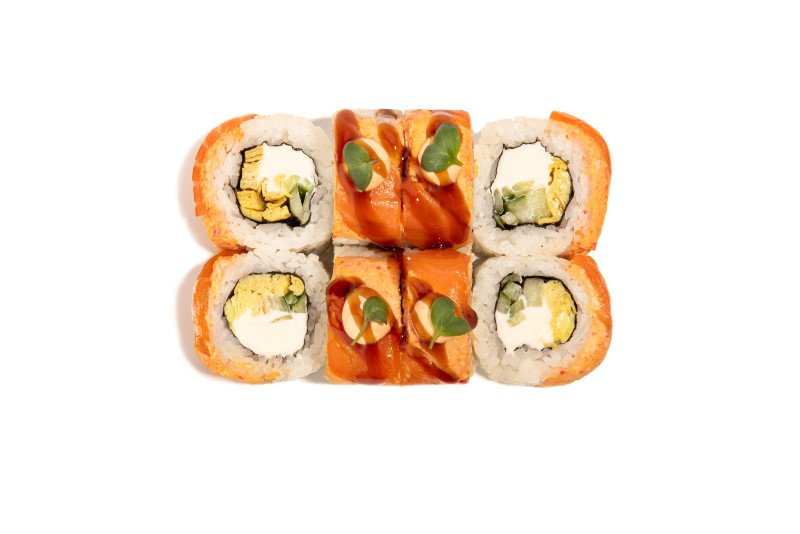 Ролл со сливочным сыром, лососем, омлетом томаго, огурцом, крабом сурими в остром соусе шрирача, соусом унаги и острым спайси соусом.