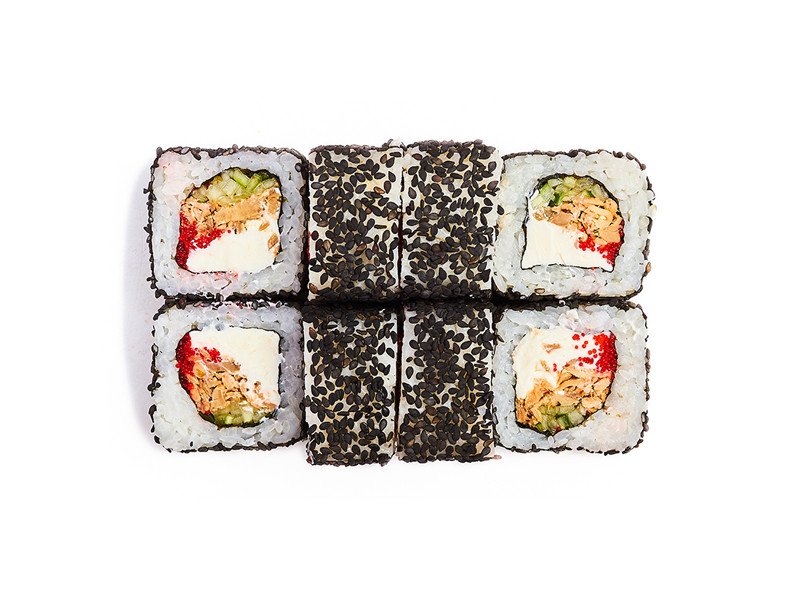 Ролл со сливочным сыром, жареным лососем терияки, огурцом, икрой массаго и кунжутом.