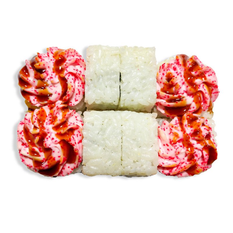 Ролл с нежной запечённой шапочкой из лава-соуса и начинкой на выбор. Украшается соусом терияки и кунжутом.