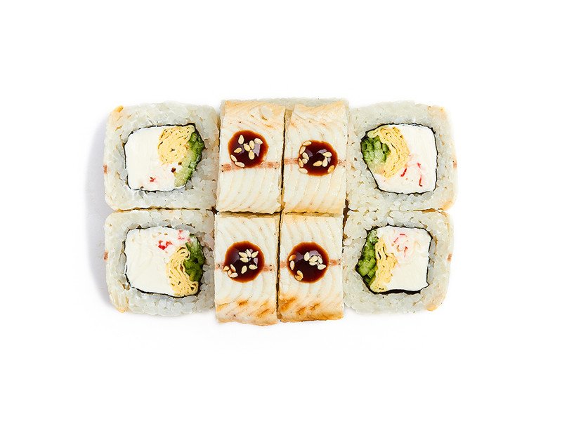 Ролл со сливочным сыром, крабом сурими, омлетом томаго, огурцом, угрём унаги, кунжутом и соусом терияки.