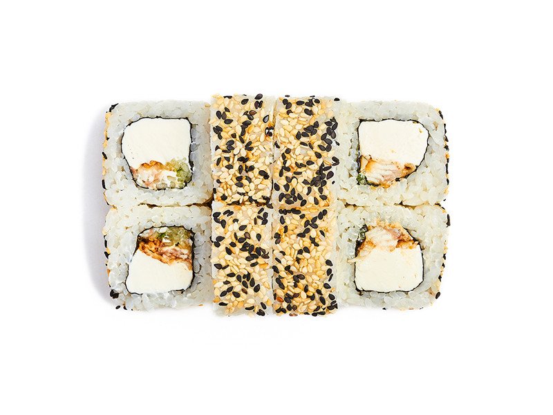 Ролл со сливочным сыром, огурцом и угрём унаги, украшеный кунжутом.