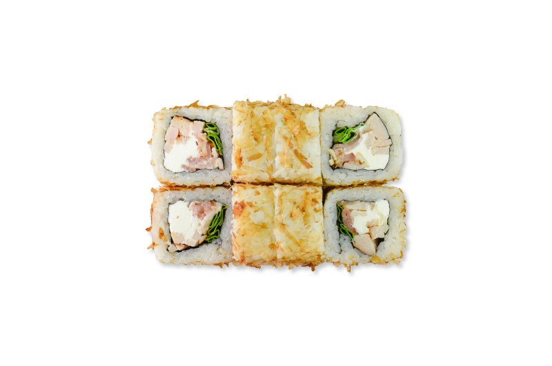 Ролл с беконом, курицей, сливочным сыром, зелёным луком и стружкой тунца.