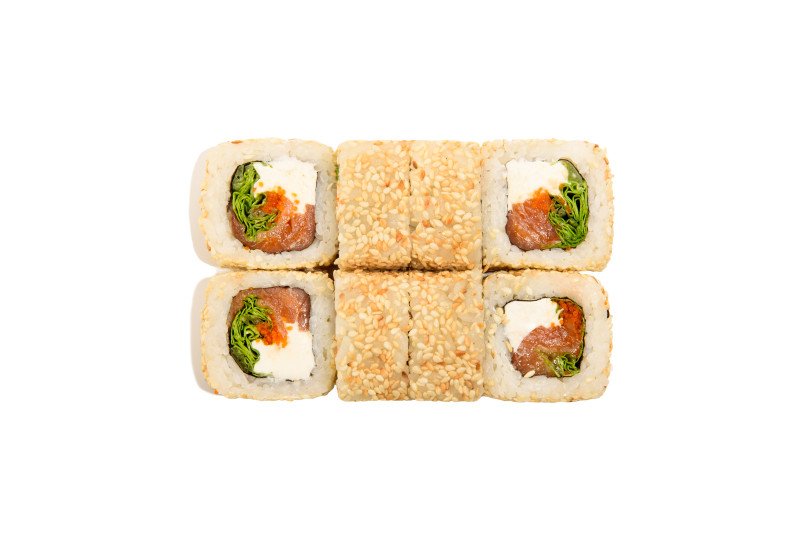 Ролл со сливочным сыром, лососем, листом салата, икрой массаго и кунжутом.