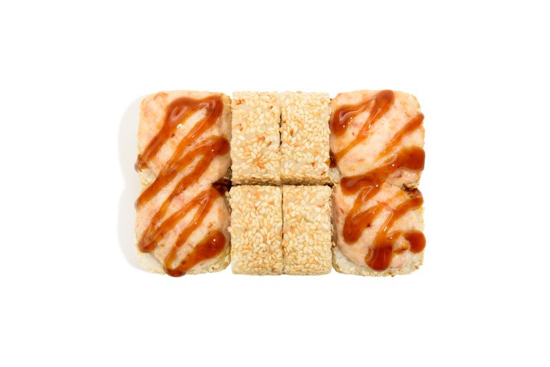Запечённый ролл со сливочным сыром, крабом сурими, томатом и кунжутом под сырной шапочкой с беконом, полит соусом терияки.