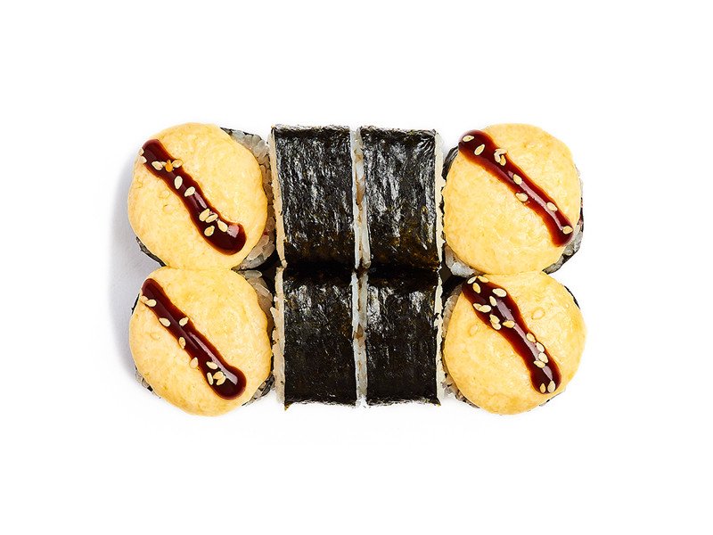 Классические роллы с огурцом и начинкой на выбор, запечённые под нежной сырной шапочкой, с соусом терияки и кунжутом.