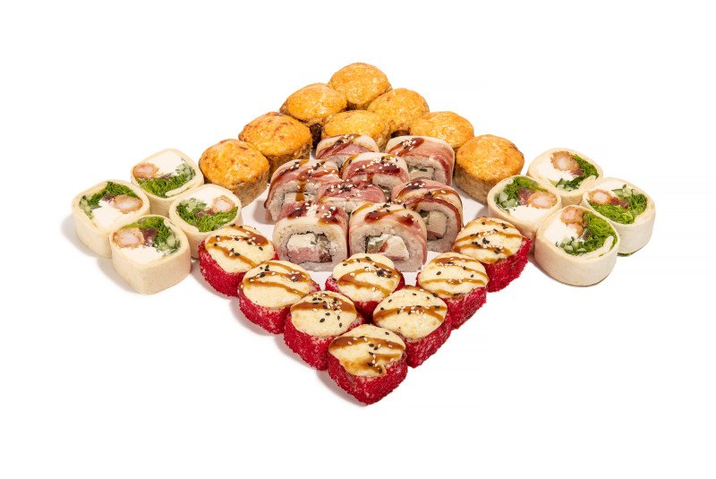 Запеченный Яки с крабом-сурими, Вулкан темпура с курицей, Биг пита ролл с креветкой, Бекон маки с ветчиной. В составе ОСТРЫЕ роллы!