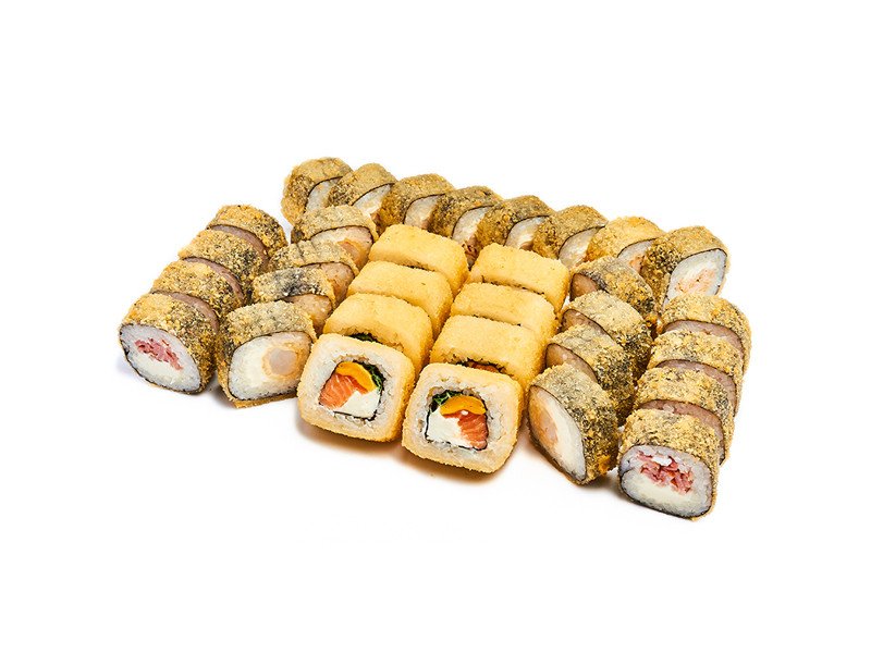 4 жаренных ролла: Темпура с креветкой, Темпура с курицей, Даблчиз с лососем, Темпура с беконом.