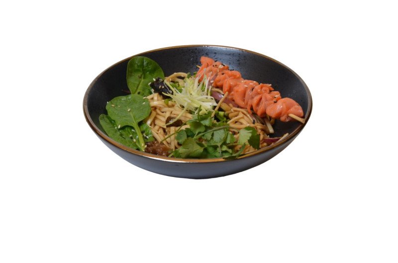 Лапша удон с запечённым лососем на шпажке, овощами, грибами Муэр и фирменным соусом Кунг Пао. Подаётся с зеленью.