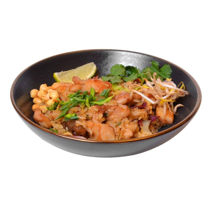 Жареный рис с курицей, грибами Муэр, яйцом, ростками сои, овощами и фирменным соусом Гёдза. Подаётся с зеленью.